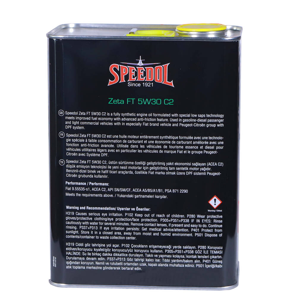 SPEEDOL ZETA FT 5W30 ACEA C2 SN/CF (DPF) 3,2LT, soğukta kolay ilk çalışma ve sıcakta güvenilir yağlama sağlayarak aşınmayı azaltır, motor ömrünü uzatır. Benzinli ve dizel motorlarla uyumlu seçenekleriyle verimli ve sessiz çalışmaya yardımcı olur. Yagoutlet.com güvencesiyle hızlı kargo ve uygun fiyatlarla.