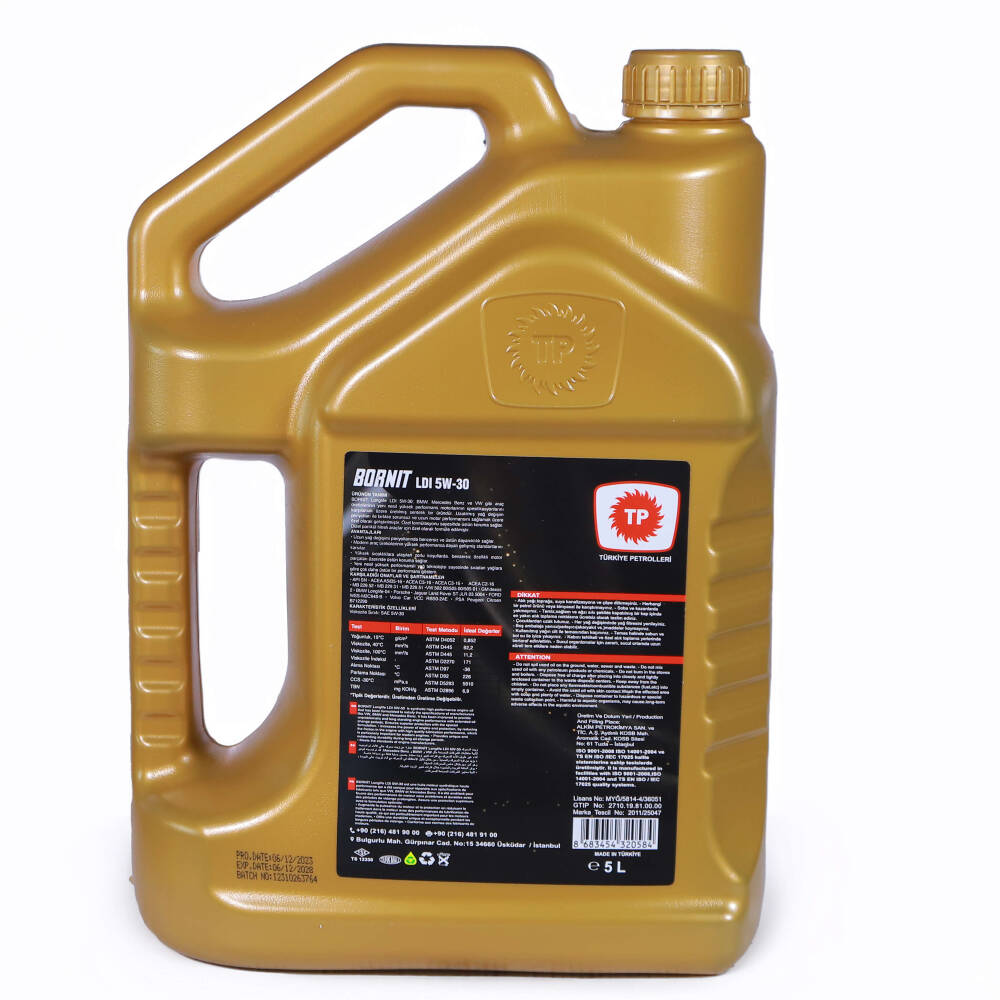 TP BORNİT Longlife LDI 5W-30 5 LT, soğukta kolay ilk çalışma ve sıcakta güvenilir yağlama sağlayarak aşınmayı azaltır, motor ömrünü uzatır. Benzinli ve dizel motorlarla uyumlu seçenekleriyle verimli ve sessiz çalışmaya yardımcı olur. Yagoutlet.com güvencesiyle hızlı kargo ve uygun fiyatlarla.